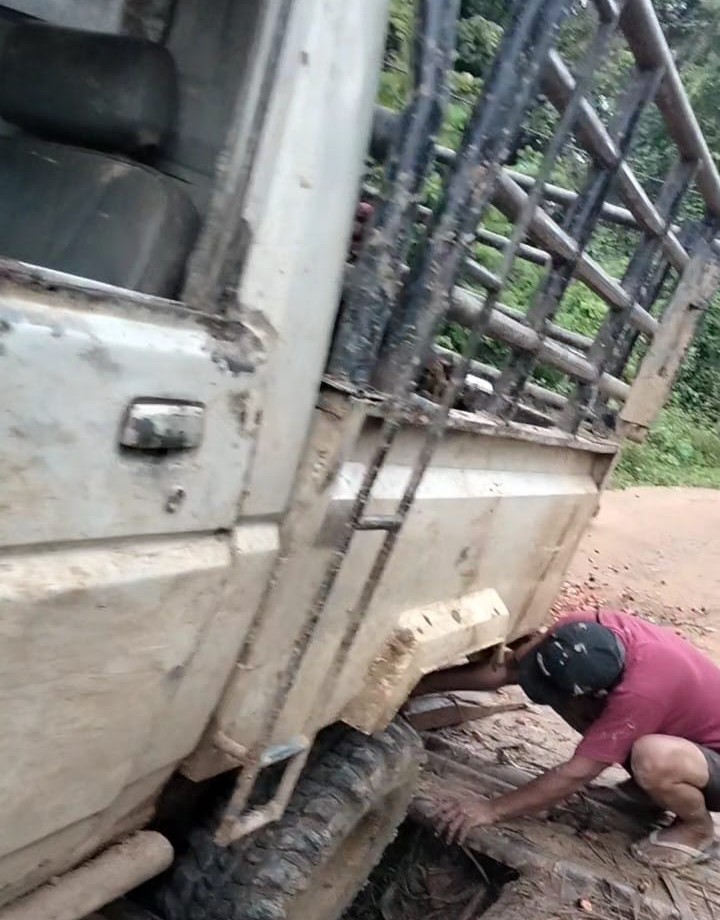 Mobil pickup dan truk angkutan hasil kebun harus antre gantian melintas dengan sangat pelan. Sopir terpaksa turun dulu untuk memastikan roda tidak terperosok. Pengendara motor pun harus ekstra hati-hati, turun dan menuntun motornya.