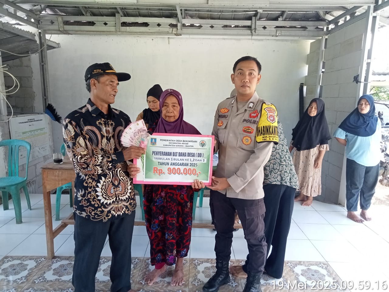 Serang Banjarsari//Pemerintahan Desa Banjarsari Kecamatan Anyer Kabupaten Serang Banten Salurkan Bantuan Langsung Tinai Dana Desa kepada Keluarga Penerima Manfaat di Aula Kantor Desa Banjarsari Senin, 19 Mei 2025
