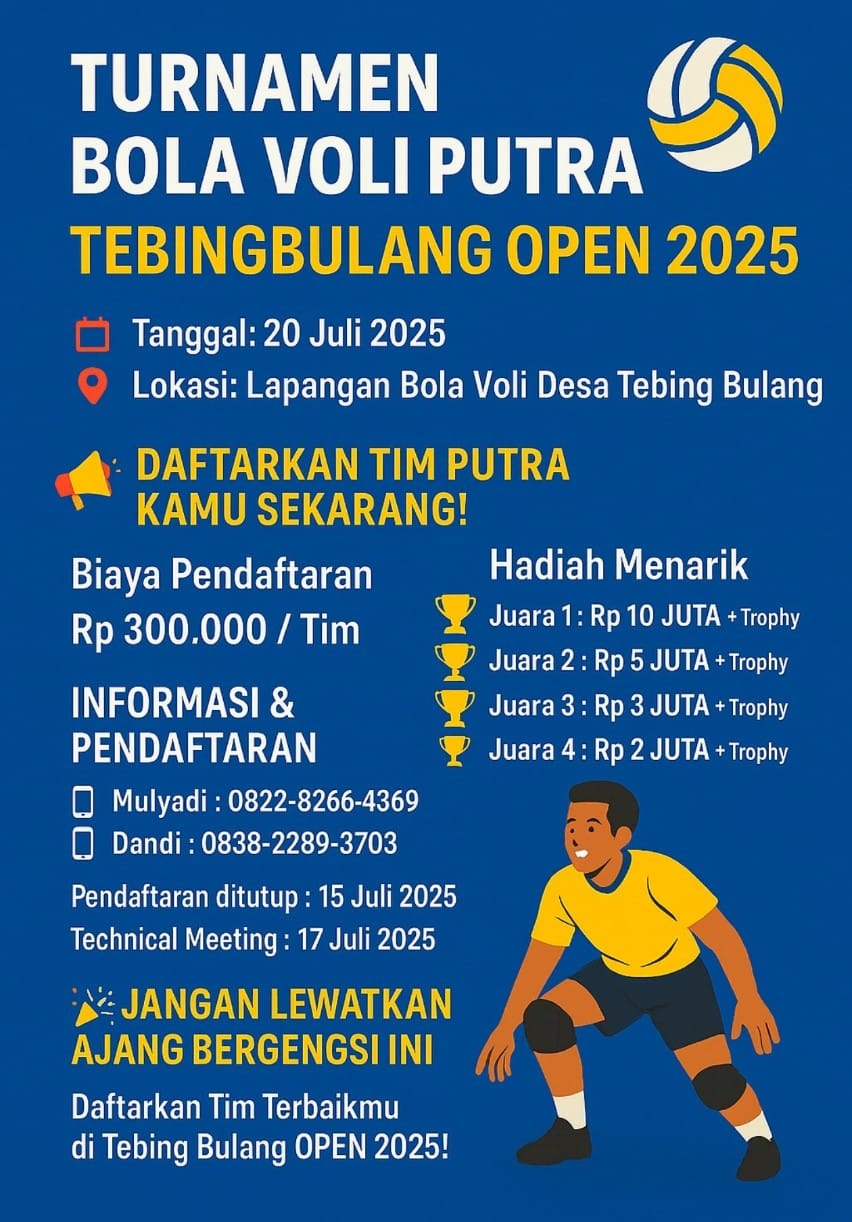 MUBA, TintaIndonesia.my.id – Semangat sportivitas dan kebersamaan pemuda kembali menggema di Desa Tebing Bulang, Kecamatan Sungai Keruh, Kabupaten Musi Banyuasin (MUBA). Pemerintah Desa Tebing Bulang secara resmi membuka pendaftaran Open Tournament Bola Voli Putra Tebing Bulang 2025.