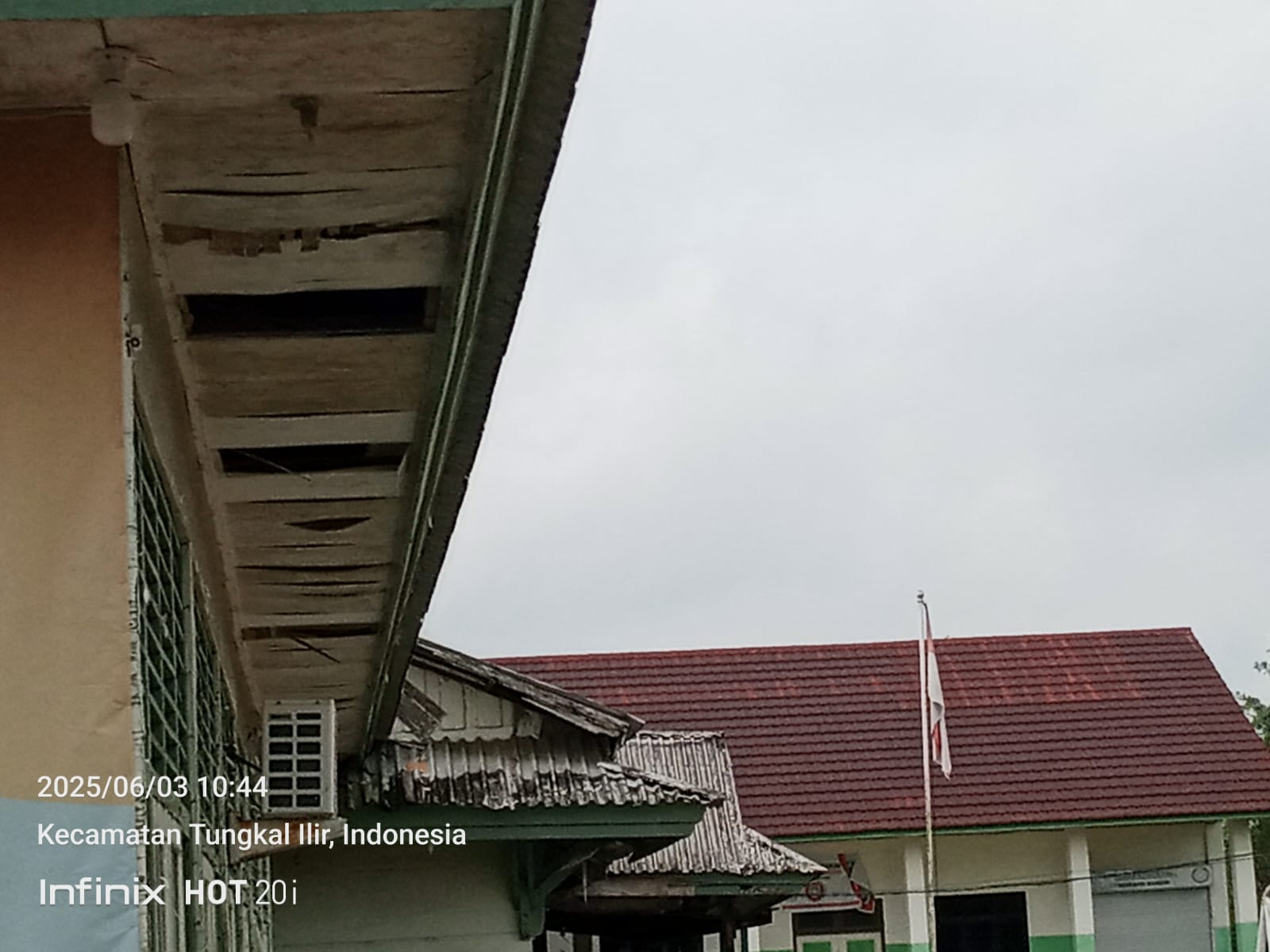Tampak dengan jelas bendera merah putih yang telah kusam dan koyak pada sisi ujungnya berkibar di depan halaman sekolah.