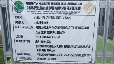 PALI, Warta Reformasi – Proyek pembangunan pagar batas Tempat Pemakaman Umum (TPU) Lebak Tanah Itam yang berlokasi di Desa Tempirai Selatan, Kecamatan Penukal Utara, Kabupaten Penukal Abab Lematang Ilir (PALI), menuai sorotan dari warga setempat karena kebetulan tidak sesuai standar dan spesifikasi teknis yang cantik.